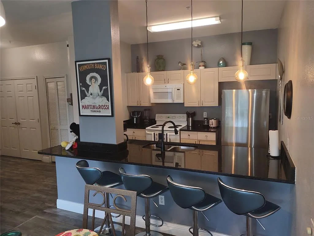 Very nicely updated and remodeled condo near Disney and just behind Margaritaville Resort and US 192. This condo is being sold "FULLY FURNISHED" and turnkey for you to put on a short term rental program or lease it long-term or live in it! This is a corner unit with excellent morning sun and afternoon shade. It is located very close to the clubhouse / amenities center and tennis courts. The unit is on the top floor and has very high ceilings throughout. The high end remodel includes granite counter tops, furniture updates througout, and vinyl plank flooring. There is a nice fully screened balcony for having your morning coffee. Large master bedroom! All bedrooms have lots of light and nice views. The community has a plethora of amenities including clubhouse, community pool and spa, splash park, playground, fitness center, arcade, general store, gated with 24 hour security. Basketball, sand volley ball, tennis courts, BBQ area, Cinema, and so much more!